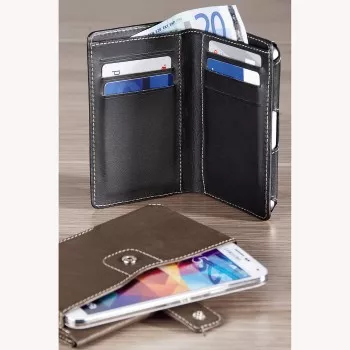 With this booklet case you will get both a smartphone case and a purse. A snap fastener ensures secure attachment of your smartphone and several compartments give you enough space for debit cards, banknotes, a parking ticket or EC card.